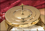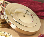 Avondmaalschaal voor bekertjes Brass Kleur Avondmaalschaal 31.43cm heeft plaats voor 40 bekertjes. Ook is het mogelijk om in het midden een klein broodschaaltje (12cm) te zetten (zie nummer 886083011276). De schaal is stapelbaar.