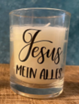 Small glass with candle in German in a beautiful simple design. Text: Seine Gnade ist genug Kor. 12:9
