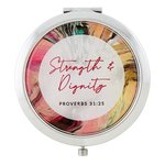 Mok Strength & Dignity. Tekst op de binnenrand van de mok. Wordt geleverd met geschenkverpakking. Materiaal: Steengoed 8,89cm - 384ml. Magnetron & Bovenrek vaatwasmachinebestendig. De tekst van Proverbs 31:25 zegt: "She is clothed in strength and dignity and she laughs without fear of the future