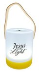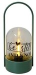 Solar lamp met LED gele vlam. Tekst: "Be the light". Afmeting: 11cm hoog, 7,5cm dia.
